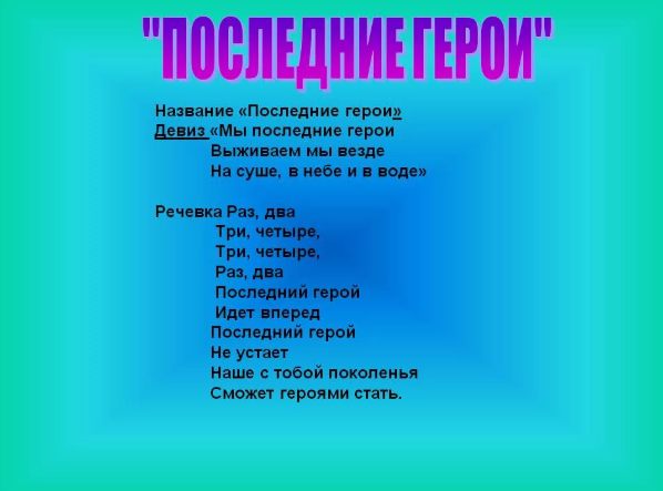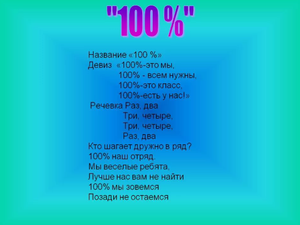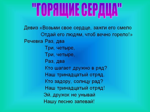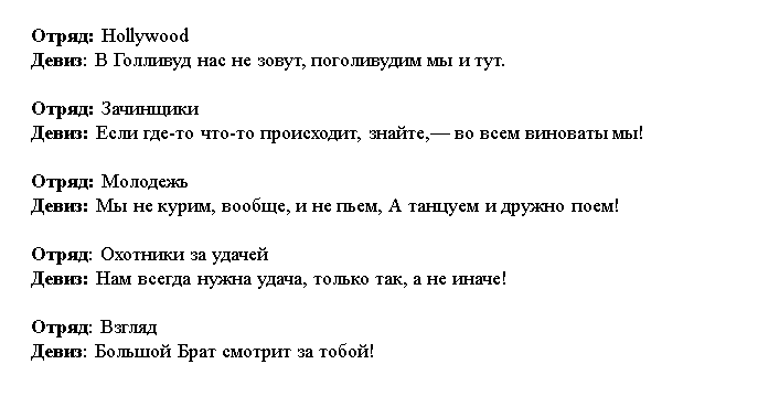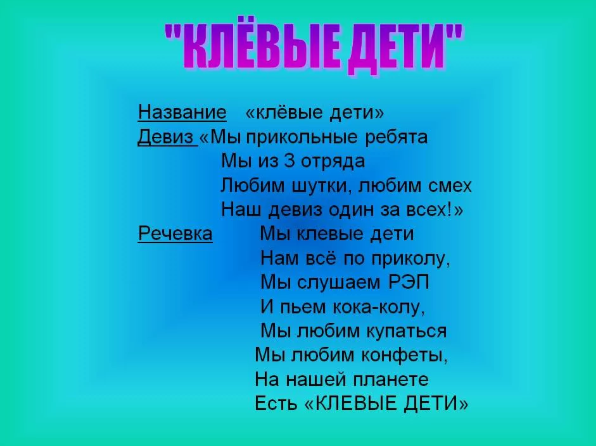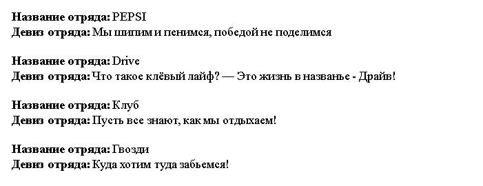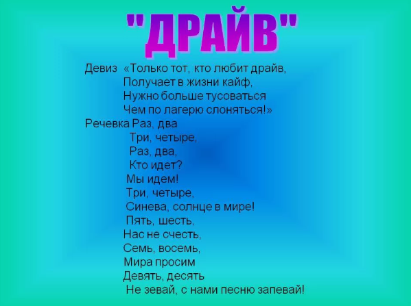 Подростки, это уже не дети, но еще и не взрослые. Тем не менее, этот возраст можно отнести к молодежи. И здесь ассоциации с героями мультфильмов или сказок не подойдут. Название и девиз должны быть задорными, призывать к действию и говорить о том, что это отряд молодых и и энергичных людей. Можно опираться на тему смены лагеря.