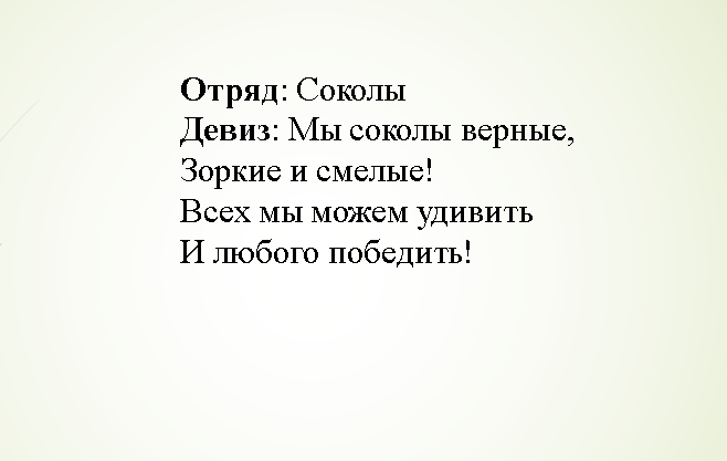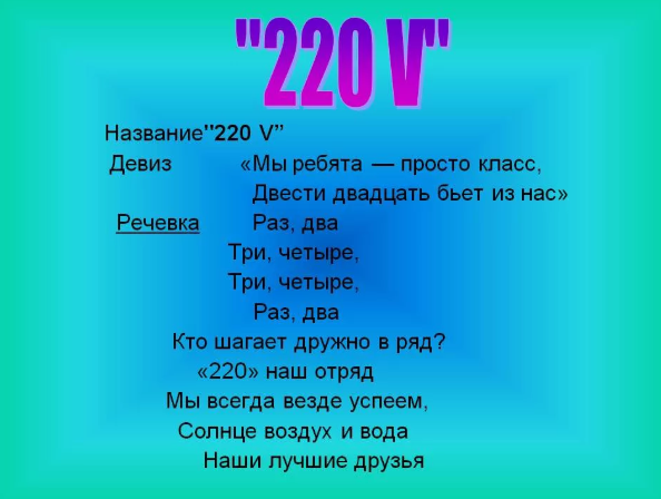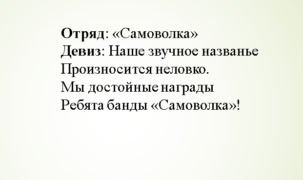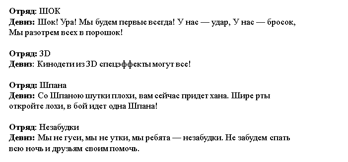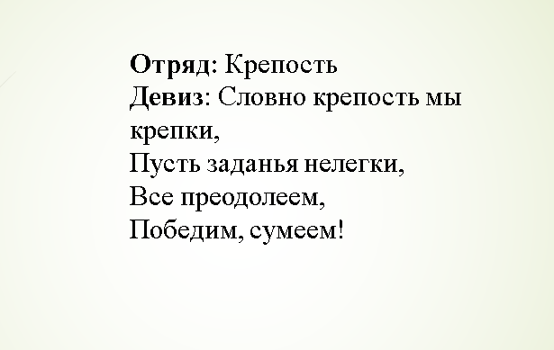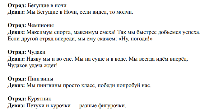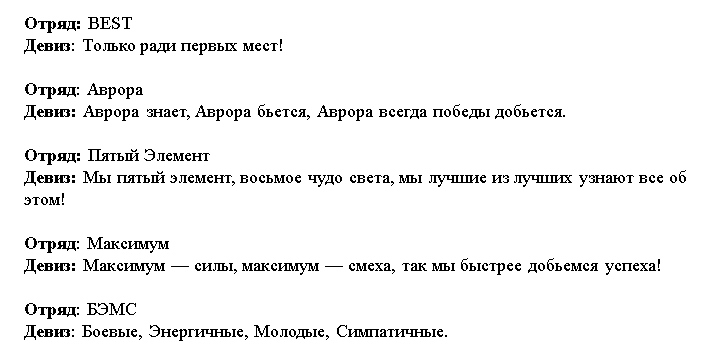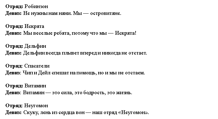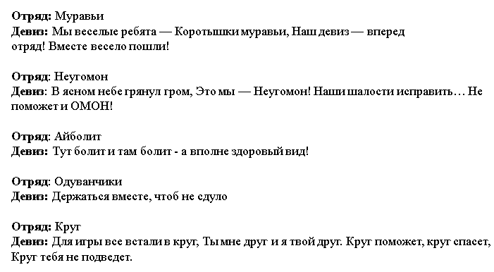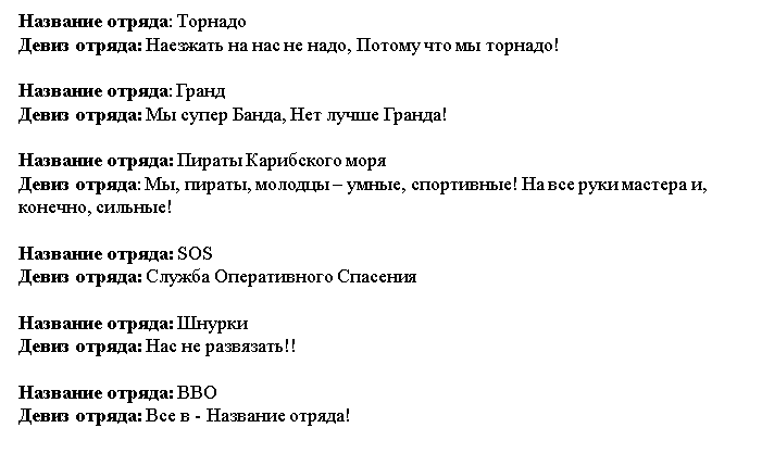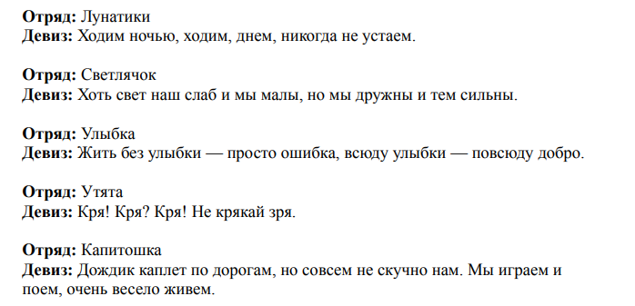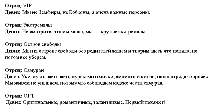 Для детей старшего возраста лучше предоставить возможность придумать самим, но следует следить за тем, чтобы название отряда не было неприличным и сложно сокращенным. Критерий — яркое и запоминающееся название и соответствующий девиз. Желательно, чтобы дети подобрали романтические и боевые название и девиз в тему.