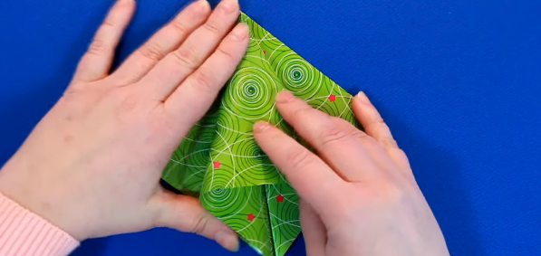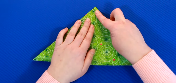 Сложим уголки заготовки, как на фото. Разгладим очень хорошо сгибы, они должны быть четкими. Удобно разглаживать кольцами ножниц.