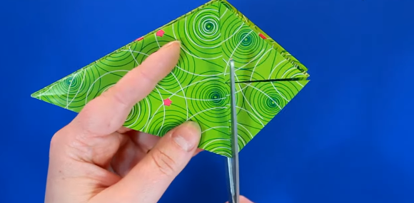 Нижнюю часть, у основания елки оригами, отрежем. Это необходимо для устойчивости изделия. Расправим фигурку. Хотите, чтобы деревце стало «пушистым»? На каждом из ребер сделайте прорези с шагом 0,5—0,7 см.