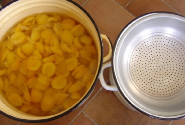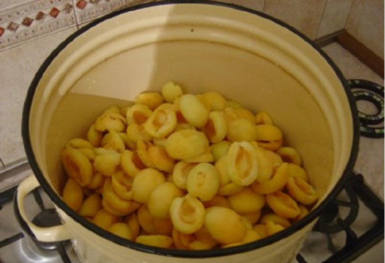 - В емкость с половинками плодов вливают небольшое количество воды, так чтобы она покрыла их полностью.