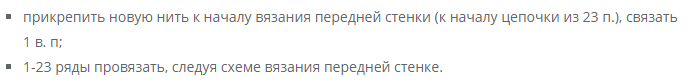 Сшить боковую стенку с передней и задней стенками провязав крючком ряд соединительных ст. от края до края. То же само проделать со второй боковой стенкой.