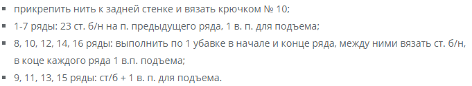 - Процесс вязания рюкзака начинается с донышка. Для этого ст. б/н. необходимо связать прямоугольную деталь 8x15 см.