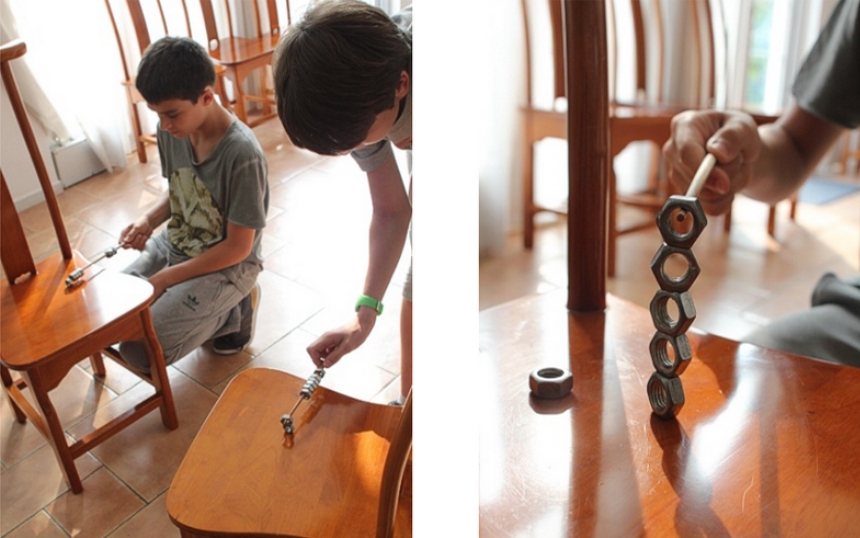 Монеты помещают в ступни безразмерных колгот. Игроки должны добраться одной рукой до каждой из монет и положить их на стул.