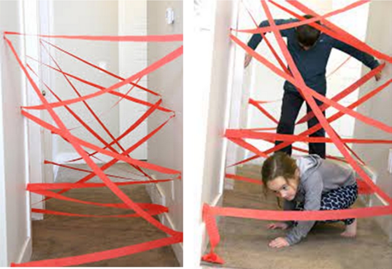 В коридоре создают лабиринт препятствий из крепированной бумаги или скотча. Ленты закрепляют на разном уровне, заставляя детей перешагивать или проползать в разных точках.