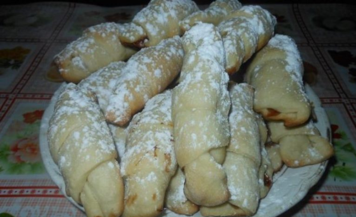 - На треугольники выложить любое повидло, закрутите в рогалики;